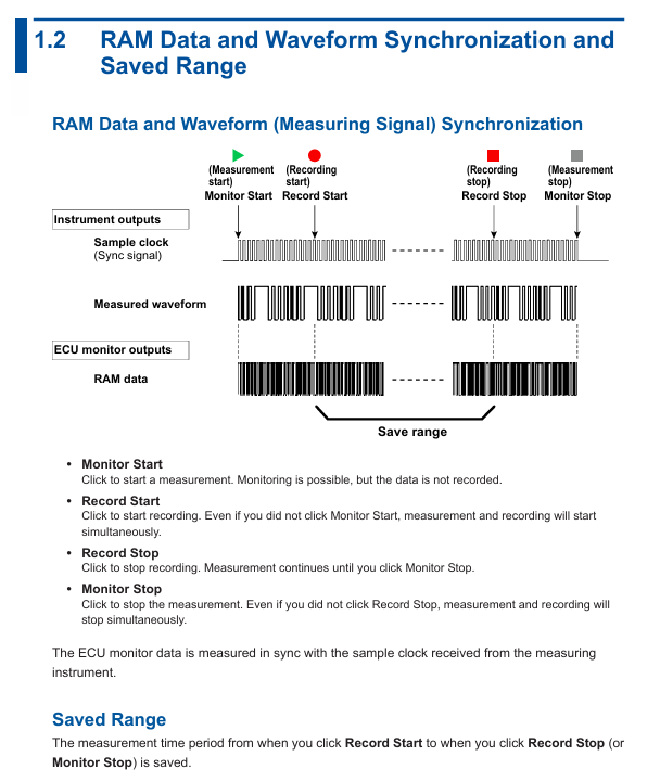 Start the ECU monitor (enter clock standby) → Press the "START" button on the measuring instrument (output sampling clock, ECU starts to acquire RAM data) → Press the "STOP" button on the measuring instrument (stop clock and RAM data acquisition) → Stop the ECU monitor;