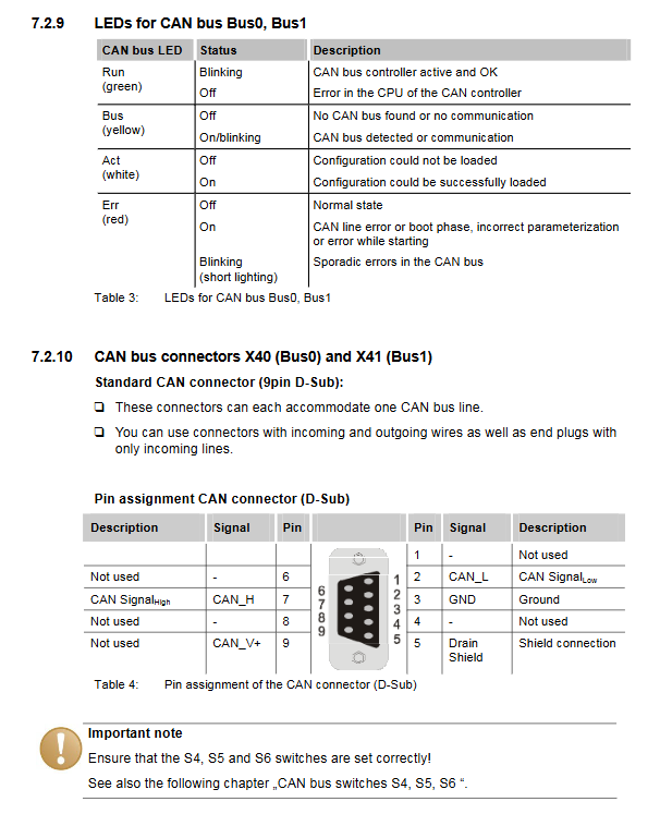 CAN bus interface X40 (Bus0)/X41 (Bus1) is connected to 2 CAN bus D-Sub9 pins, Pin2=CAN_L, Pin7=CAN-H, Pin3=GND, Pin5=shielded