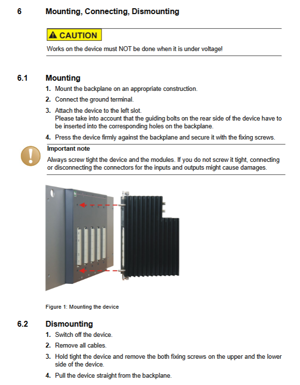 First, fix the backplate (such as ibaPADU-B4S) onto the mounting plate or DIN rail;