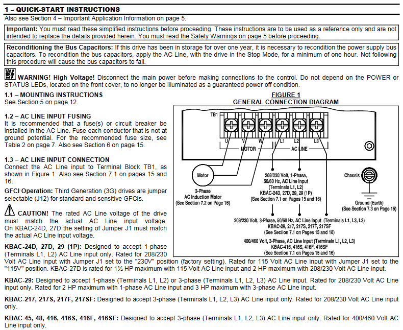 The KBAC series adjustable frequency drive is suitable for three-phase AC motors and has a NEMA 4X/IP65 protection level. It can achieve waterproof and dustproof performance and is suitable for indoor and outdoor flushing environments. Supports voltages of 208-230V and 400/460V, with a frequency of 50/60Hz, capable of driving motors ranging from sub fractional horsepower to 10 horsepower. It also has variable speed, soft start function, and electronic motor overload protection. It is compatible with AC inputs of 115V, 208/230V, and 400/460V, and is available in 2G and 3G models. Some 3G models have product labels labeled "(3G)", and both KBAC-217 and 416 series are 3G models.