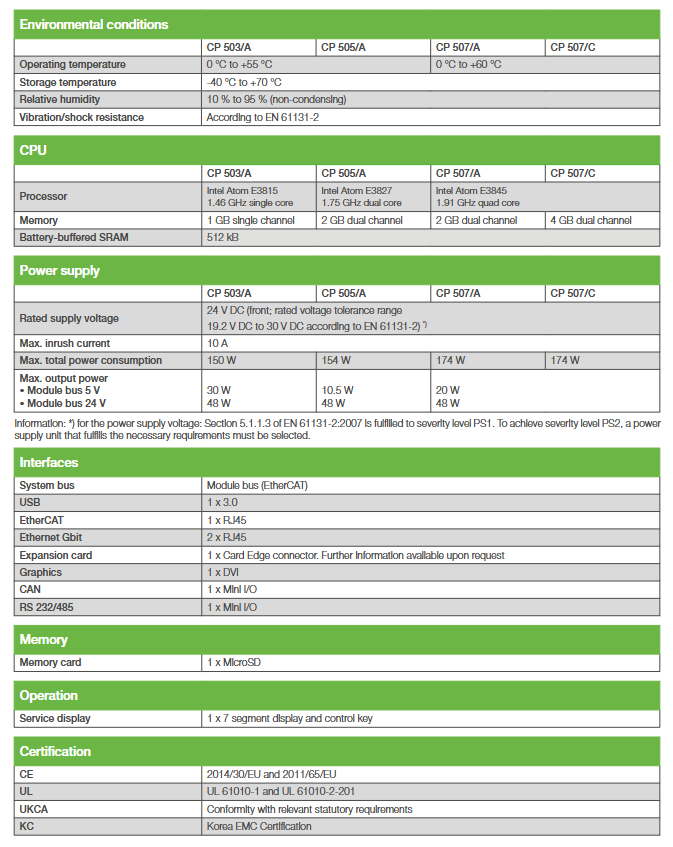CP 503/A Intel Atom E3815 (1.46GHz single core) 1GB single channel 80 × 121 × 90.6mm 150W fanless, 1 × EtherCAT master station