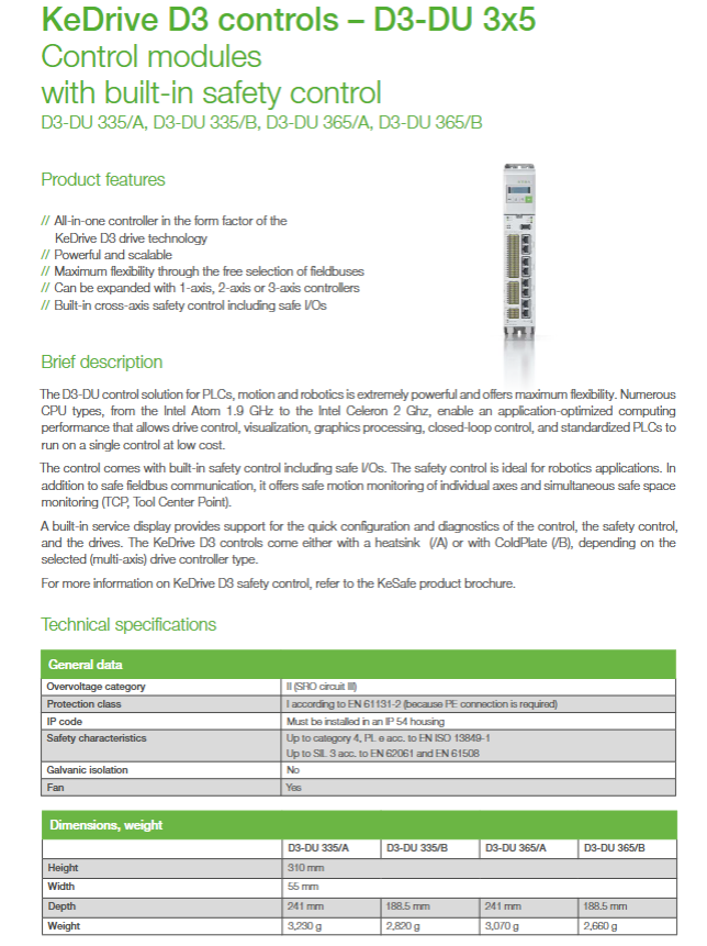 Safety level: KeDrive D3-3x5 series complies with EN ISO 13849-1 PL e, EN 62061 SIL 3, supports safety motion monitoring