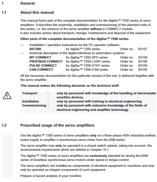 KOLLMORGEN digifas ™ The installation and operation guide for the 7200 series digital servo amplifier (including models 7201/7204/7206, etc.) is designed to adapt to three-phase 400V industrial power supply and provide speed/torque control for 6SM series brushless synchronous servo motors. It supports ± 10V analog setpoint input, incremental encoder/SSI interface feedback, peak output current up to 12A, working temperature * * -25 ° C to+55 ° C * * (power derating required), protection level IP20, EMC compliant design, energy feedback braking (ballast circuit), and complete fault protection. It is equipped with BS7200 software to achieve parameter configuration and monitoring. The manual covers the entire process of installation, wiring, debugging, fault troubleshooting, etc., and is suitable for multi axis industrial motion control scenarios.