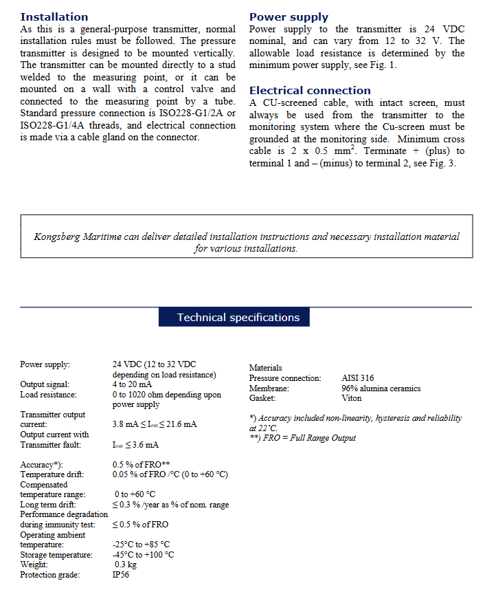 This series supports a pressure range of up to 100 bar and adopts the industry standard 2-wire connection method, with output signals ranging from 4 to 20mA analog. This signal system has strong anti-interference ability and is suitable for long-distance transmission, making it a classic choice for industrial sites. Its nominal power supply value is 24 VDC, allowing for fluctuations within a wide voltage range of 12 to 32 VDC, greatly facilitating compatibility with different ship or factory power supply systems.