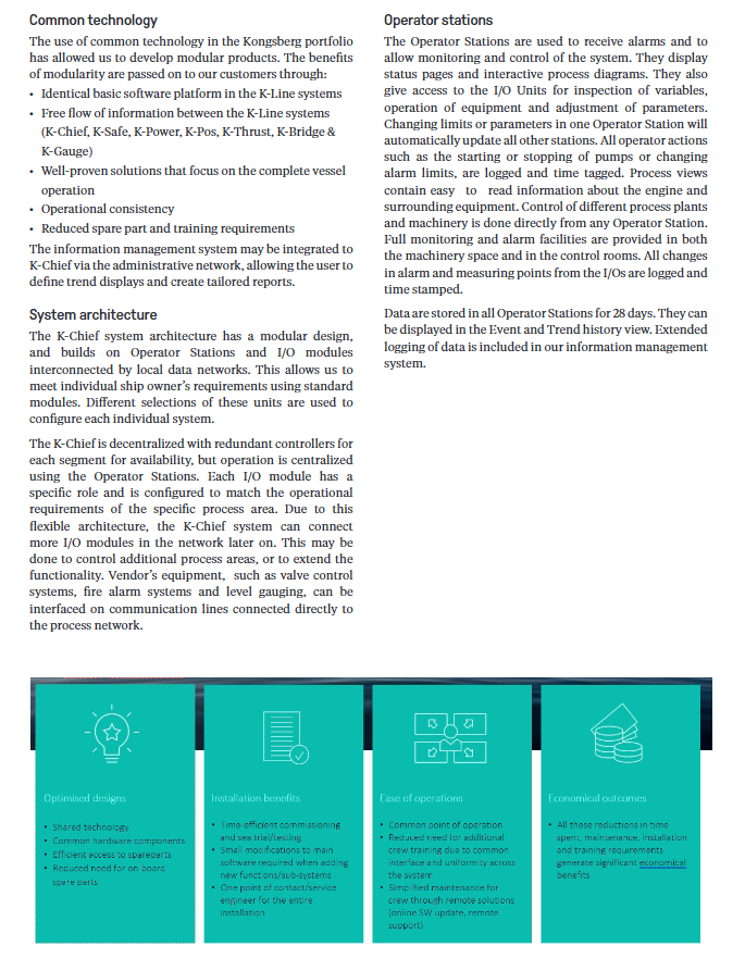 Kongsberg has launched the K-Chief ship automation system based on 50 years of experience in maritime automation. Its core advantages include modular design, high redundancy, full integration with K-Line products, and built-in configuration tools. It can cover 10-50000 I/O points and is suitable for various types of ships such as oil tankers and container ships. It integrates multiple subsystems such as alarm monitoring, power management, and propulsion control, and meets standards such as IMO and IACS, as well as certifications from mainstream classification societies such as DNV and CCS. It has the characteristics of easy installation, intuitive operation, and low maintenance costs, and supports remote support and information management functions.