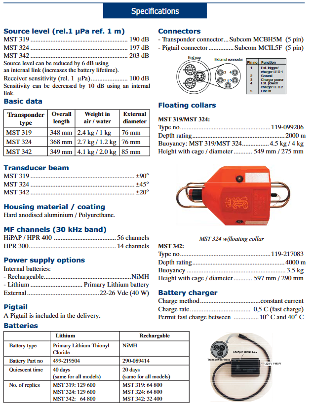 The responder model consists of a prefix, a number, and a suffix, with each part representing a fixed meaning that can quickly identify device parameters. For example, MST 319/N represents the 30kHz frequency band, 1000 meter depth level, ± 90 ° beamwidth, and mini SSBL responder equipped with nickel hydrogen rechargeable batteries. Specific rules: