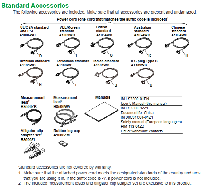 Standard accessories: including 1 power cord with matching suffix code (such as - H for Chinese standard, - Q for British standard, etc., - Y without power cord needs to be provided), measuring wire (B8506ZK/B8506WA), crocodile clip adapter set, rubber foot cap, and complete manual. Confirm that the accessories are intact.