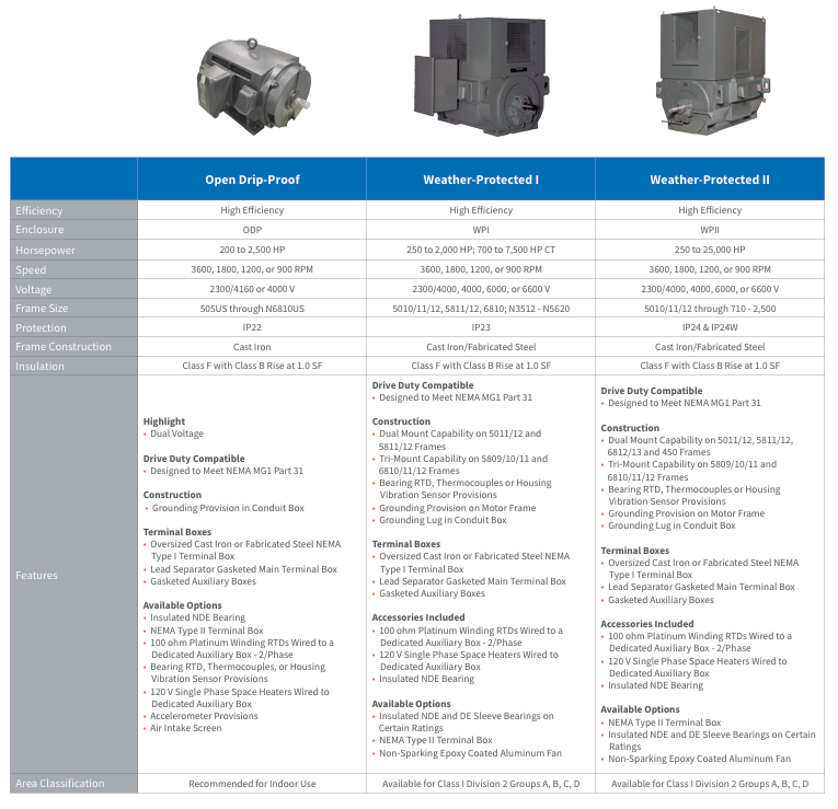 Open Drip Proof ODP 200-2500 HP IP22 dual voltage drive compatible, compliant with NEMA ISO14001 Part 31, cast iron base, large cast iron/welded steel NEMA I junction box with lead separation gasket, optional insulated NDE bearings, NEMA II junction box indoor universal scenario