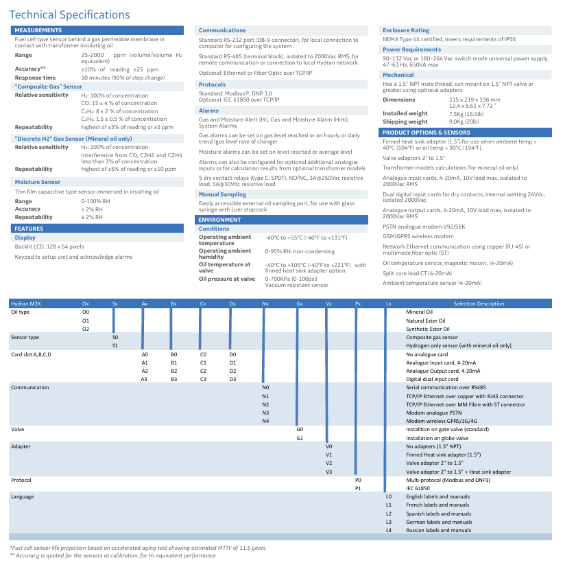 Sensor options: Traditional composite gas sensors (H ₂, CO, C ₂ H ₄) or single H ₂ sensor (mineral oil only)