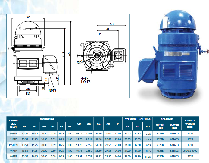 TECO-Westinghouse MAX-VH ™/ MAX-VHP ™ Series of vertical hollow shaft induction motors, covering a power range of 7.5-1000 HP, suitable for 230V/460V (low voltage), 2300V/4000V (medium voltage) voltage, synchronous speed of 900/1200/1800 RPM, using high-grade cast iron frame, 1045 carbon steel hollow shaft and F-class insulation system, with a protection level of IP23 (WP1)/IP55 (TEFC), certified by NEMA MG-1/MG-13 standards, with a service factor of 1.15 and a 36 month warranty. The core application is in direct coupling scenarios such as pumps, supporting direct start, star delta start, VFD start, and key performance including 125% overspeed tolerance and 160% rated torque tolerance. It is a highly reliable power equipment for industrial heavy-duty scenarios