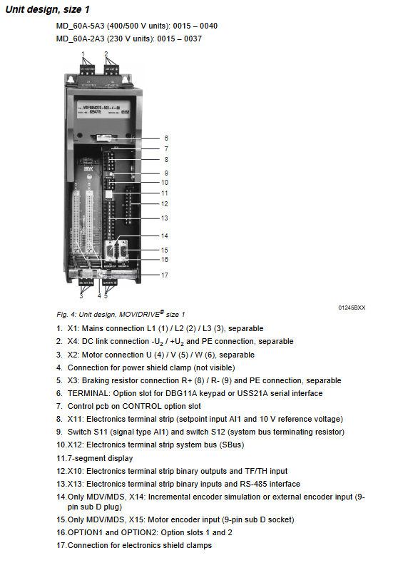 SEW MOVIDRIVE ® MD-60A is an industrial grade frequency converter launched by SEW, covering 5 sizes (1-5) and 2 voltage specifications (230V/400-500V). It supports three core control modes: VFC/CFC/SERVO, adapts to asynchronous/synchronous motors, has a rated power of 1.5-75kW and a current of 4-130A, and has two debugging methods: DBG11A panel and MOVITOOLS software. It supports RS-485/Bus communication and multi class option expansion. It has passed EMC/UL certification and is suitable for machine tools, automated production lines and other scenarios. It also has complete fault diagnosis (99 fault codes) and safety protection functions. Installation needs to meet specific heat dissipation gaps and wiring specifications.
