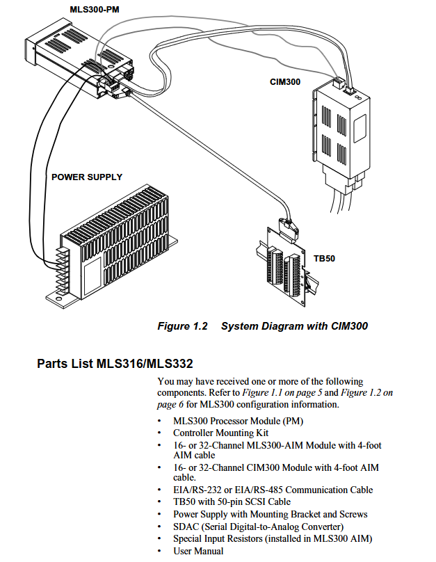 The MLS300-PS power module inputs 120/240V AC and outputs 15V DC/1.2A and 5V DC/4A, providing isolated power supply for the system