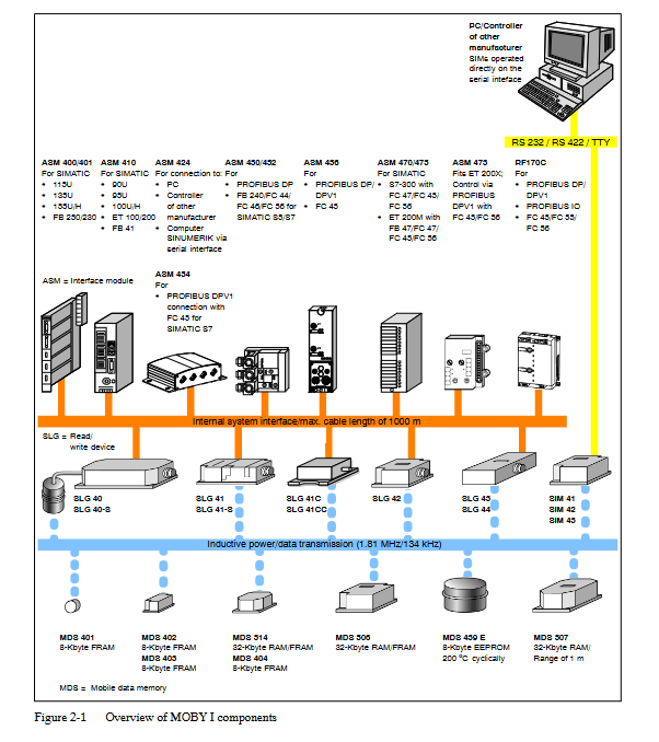 MOBY I is a high-performance radio frequency identification system (order number 6GT2 097-4BA00-0EA2) released by Siemens in 2007. Its core is used for contactless material flow and production process optimization in industrial scenarios. It consists of a mobile data storage (MDS), a read-write device (SLG), an interface module (ASM), and supporting accessories. It supports 8-32 kbytes storage capacity, 0-1000 mm read-write distance, -25 ° C to 200 ° C (cyclic) working temperature, and can be connected to SIMATIC S5/S7, PC and other devices as well as PROFIBUS protocol. The document covers system configuration, installation specifications, component parameters, fault troubleshooting, and other content in detail. Only qualified professionals are allowed to operate it to ensure safety and equipment. Compatibility.