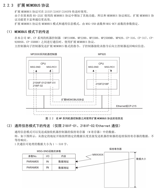 Extended MEMOBU: MEMOBU extension, adding function codes such as 09H (extended read hold register), transmitting 1-508 words at once, supporting MEMOBU/general information mode