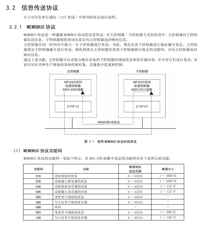 MEMOBU: Yaskawa standard, main controller specifies sub controller address communication, function codes include 01H (read winding), 03H (read hold register), etc., supporting 1-2000 bits (bit data), 1-125 words (word data)