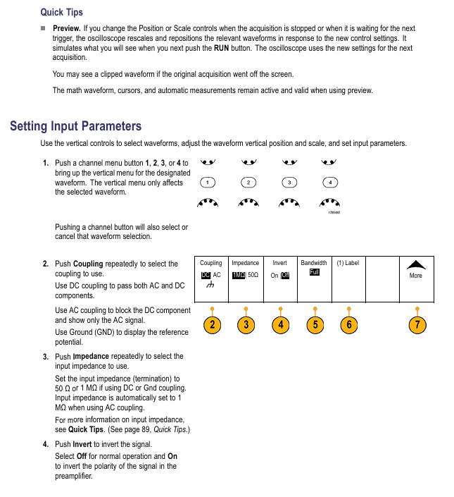 Select 1M Ω/50 Ω (50 Ω only DC/GND coupling, maximum 1V/div) according to the 'Impedance' button;