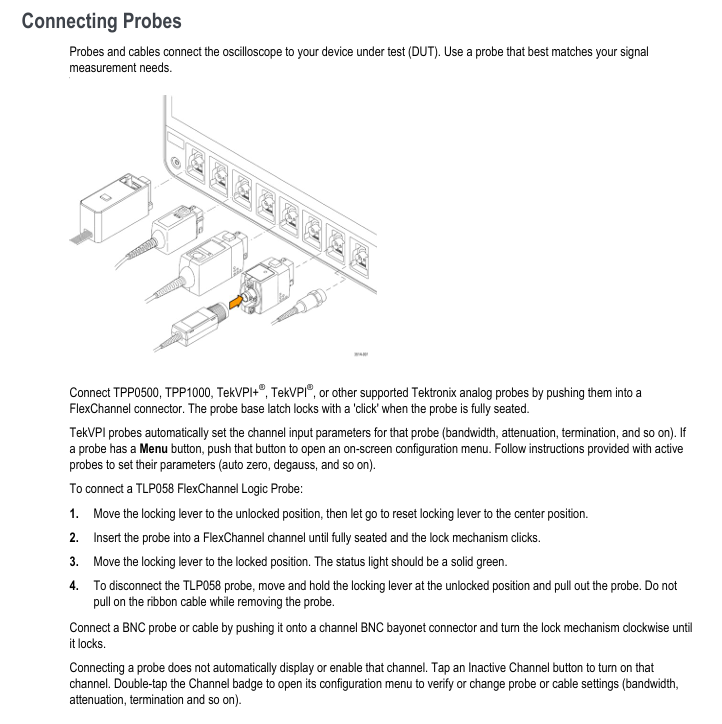 Connect probe: Insert the probe into the FlexChannel connector and hear a "click" sound to indicate it is locked in place. The TekVPI probe will automatically configure channel parameters (bandwidth, attenuation, etc.).