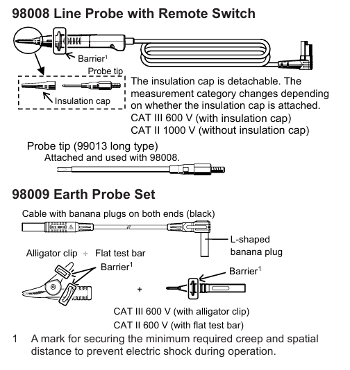 Measurement category restriction: The rated measurement category of the instrument is CAT III 600V, and it is prohibited to use it for CAT IV or main power circuits exceeding 600V; When the probe is paired with different accessories, the category is different (for example, 98008 with insulation cap is CAT III 600V, and without cap is CAT II 1000V).