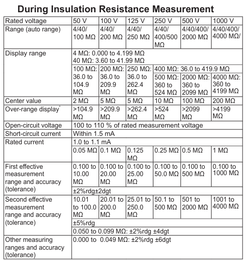 Accuracy: First effective range (such as 1000V range 0.100~1000M Ω) ± 2% reading ± 2 digits; Second effective range (1001~4000M Ω) ± 5% reading.