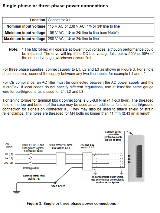Voltage parameter main circuit input 115-230VAC (single/three-phase), 105-250VAC wide range