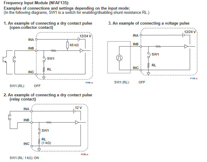 Input frequency: 0~10 kHz (with changes in wiring capacitance during dry contact pulse input: 0~800 Hz at 1000 pF, 0~350 Hz at 10000 pF, 0~180 Hz at 30000 pF);