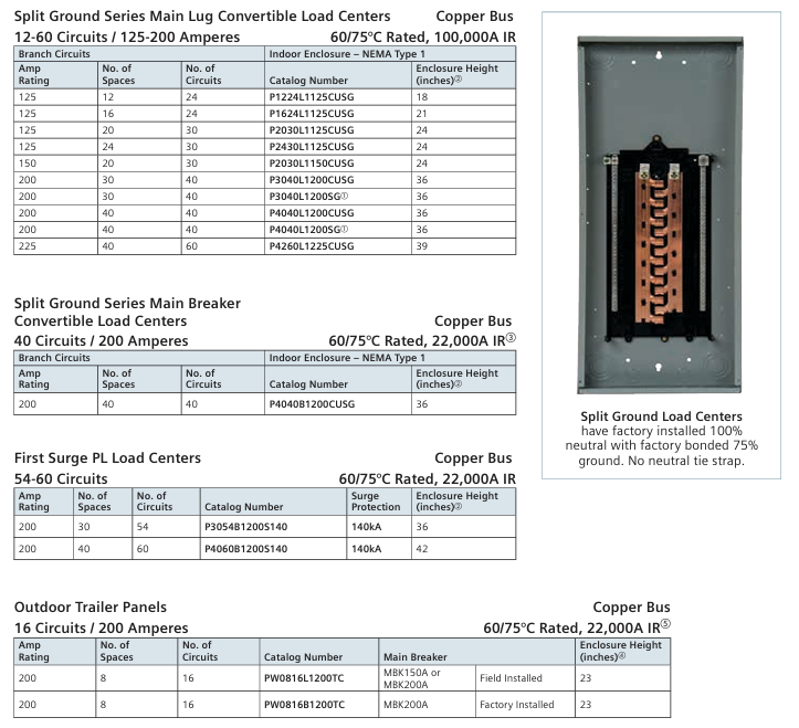 Main circuit breaker conversion: PL series 100A load center requires MBK100A kit, 225A requires MBK225A; The ES series 200A requires MBK200A.