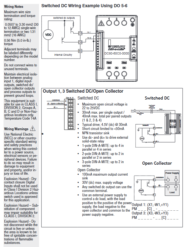 Wiring specifications: Supports 12-30 AWG wires, terminal torque 5.0 in lb, must comply with electrical standards such as NEC, and use certified switches in hazardous areas