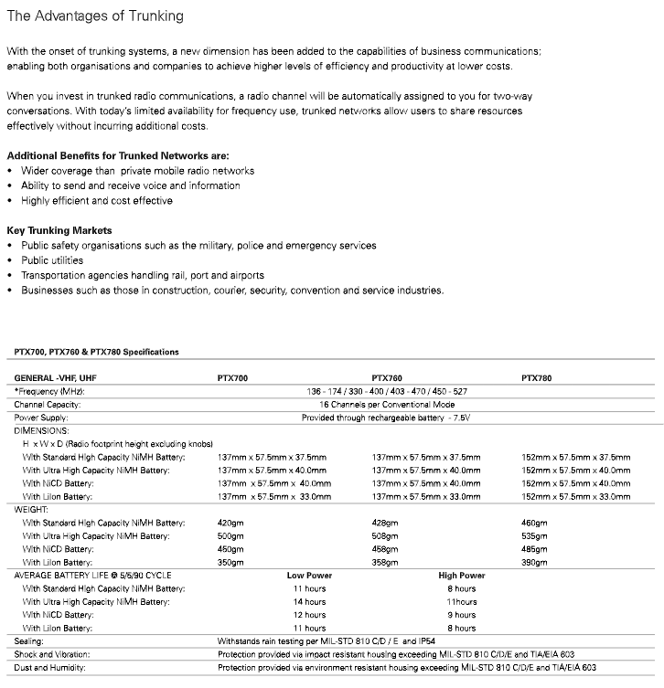 The Motorola PTX700/760/780 is a portable professional walkie talkie compatible with the MPT1327 cluster standard, aimed at industries such as public safety, utilities, and transportation. It has common functions such as 12.5/20/25kHz programmable channel spacing, X-PANDIM voice enhancement technology, MAP27 data interface, and supports multiple communication modes such as individual calls, group calls, and emergency calls; The differences among the three models are reflected in the number of personalized configurations (2/4/60), contact list capacity (16/40/40), programmable dedicated call buttons (3/3/6), and advanced functions (PTX780 adds built-in voice storage and ultra long data message transmission), paired with NiMH/NiCD/Li ion batteries (weight 350-535gm, range 8-14 hours), with industrial grade reliability such as IP54 protection and shock and vibration resistance, meeting the efficient communication needs in mobile scenarios.