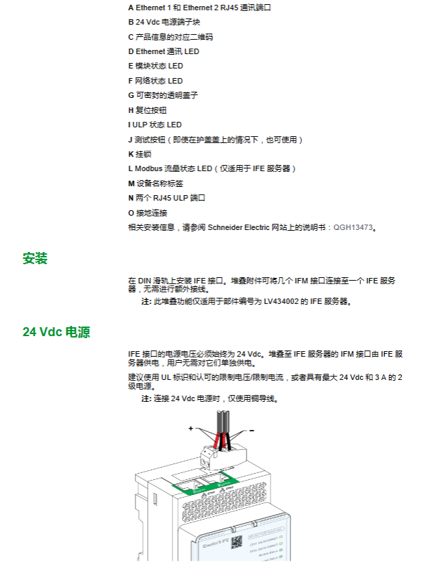 The power requirement is 24Vdc, and the stacked IFM interface is powered by the IFE server