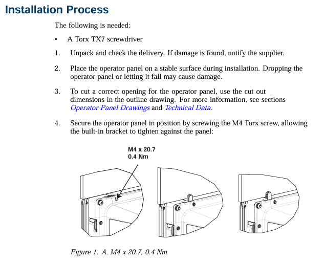 Cutting and fixing of openings: Cut suitable openings for the operation panel according to the opening size in the contour diagram (refer to the "Operation Panel Drawing" and "Technical Data" sections for detailed information); Use M4 Torx screws (specification M4 × 20.7, torque 0.4Nm) to secure the operation panel, ensuring that the built-in bracket is tightly attached to the panel.