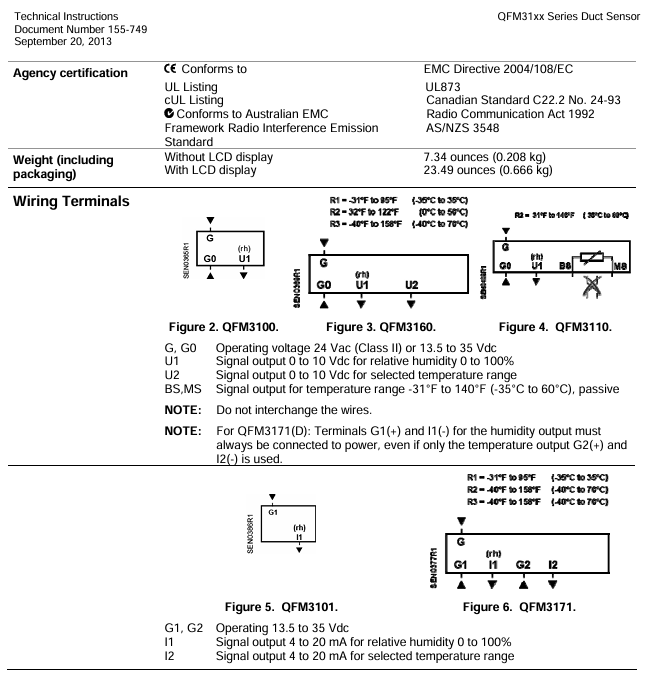 Electrical specifications: The power supply requires the use of a Class II transformer (independent winding, 100% duty cycle), and the selection should consider sensor power consumption and local electrical regulations.