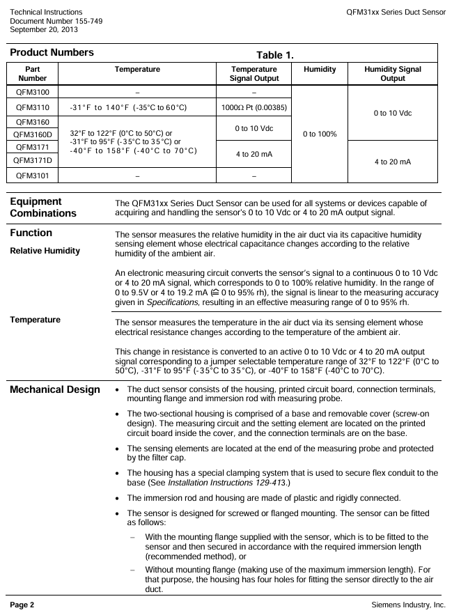 Functional roles: Air supply/return control sensor, humidity limit sensor after steam humidifier, building automation system (BAS) access sensor.