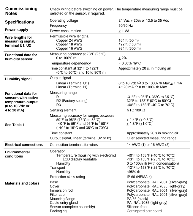 Humidity output with two signal types: 0-10 Vdc (corresponding to 0-100% RH, maximum current 1mA); 4-20 mA (corresponding to 0-100% RH)