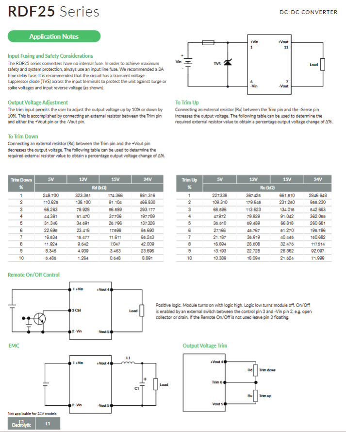 Voltage reduction: Trim pin and+Vout indirect resistor Rd (refer to the document table for selection)