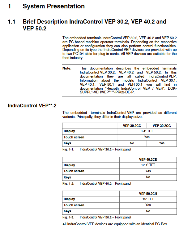 The REXROTH IndraControl VEP30.2/40.2/50.2 series embedded terminal is a PC based human-machine interaction device suitable for industrial scenarios, covering three models: 8.4-inch (VEP30.2), 12.1-inch (VEP40.2), and 15 inch (VEP50.2). It comes standard with 128MB memory and 128MB Compact Flash card, and is equipped with Windows CE 4.2. NET operating system. It supports RS232/USB/Ethernet/VGA multiple interfaces, with a front protection level of IP65. It is compatible with food processing, machine tools, printing and other equipment, and can configure parameters through Rexroth CE Settings. It needs to be paired with IndraLogicWinCE (authorized) and WinStudio visualization software to achieve control functions.