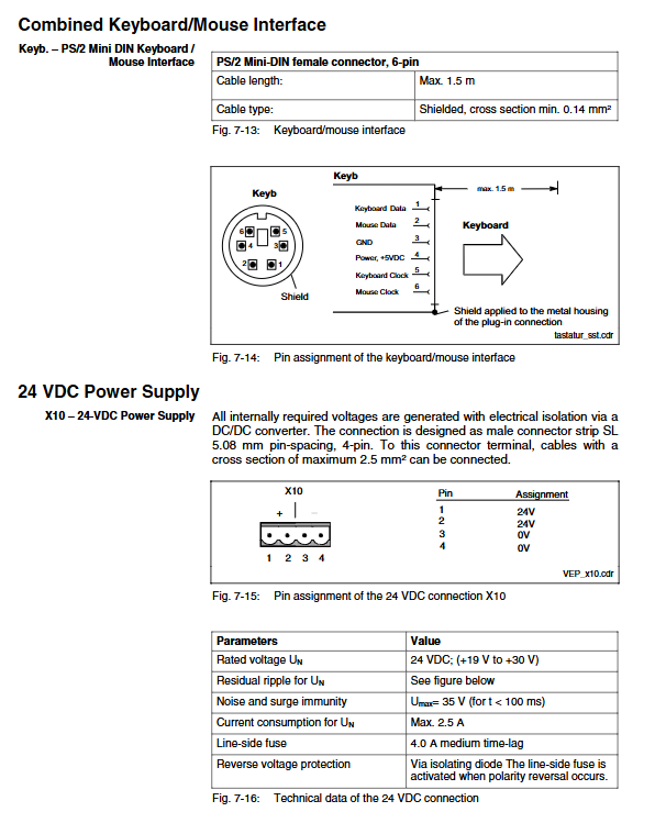 PS/2 6-pin Mini DIN interface, supports keyboard/mouse, maximum cable length 1.5m