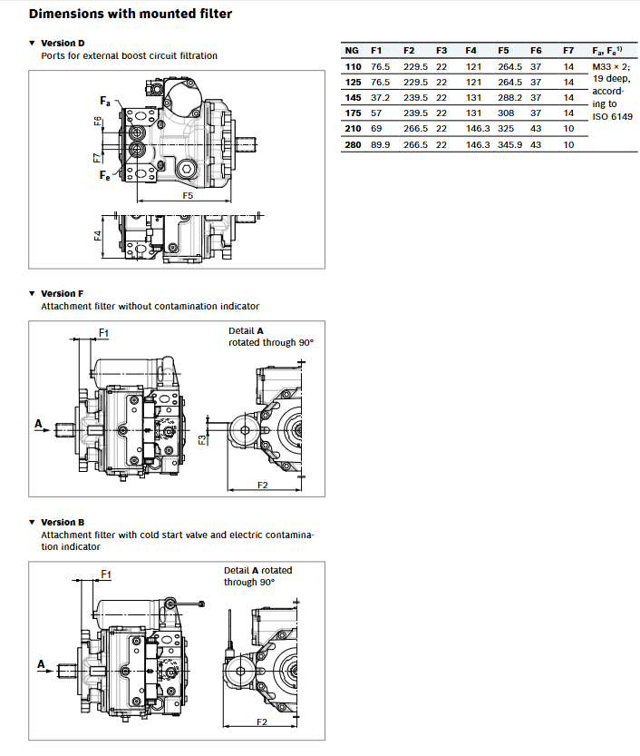 Key dimensions and displacement | Specification (NG) | Main pump displacement (cm ³/rev) | Auxiliary pump displacement (standard/large, cm ³/rev) | Weight (without through drive, kg) | Maximum speed (rpm)|
