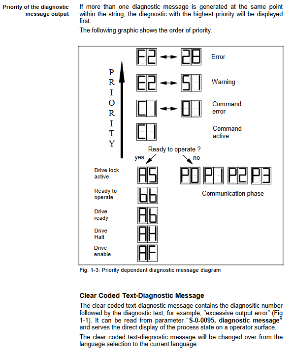 Structure composition: Each diagnostic message contains a "diagnostic number+diagnostic text", for example, "F2/28 excessive output error". The number is displayed alternately on the H1 screen, and the complete text can be viewed for parameter S-0-0095.