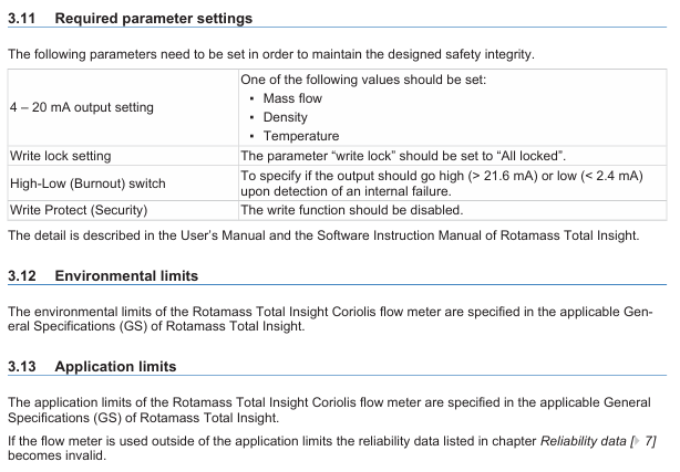 Environmental and application limitations: The environmental and application limitations of the device must comply with the General Specification (GS) of ROTAMASS Total Insight; If the application limit is exceeded, the reliability data will be invalidated.