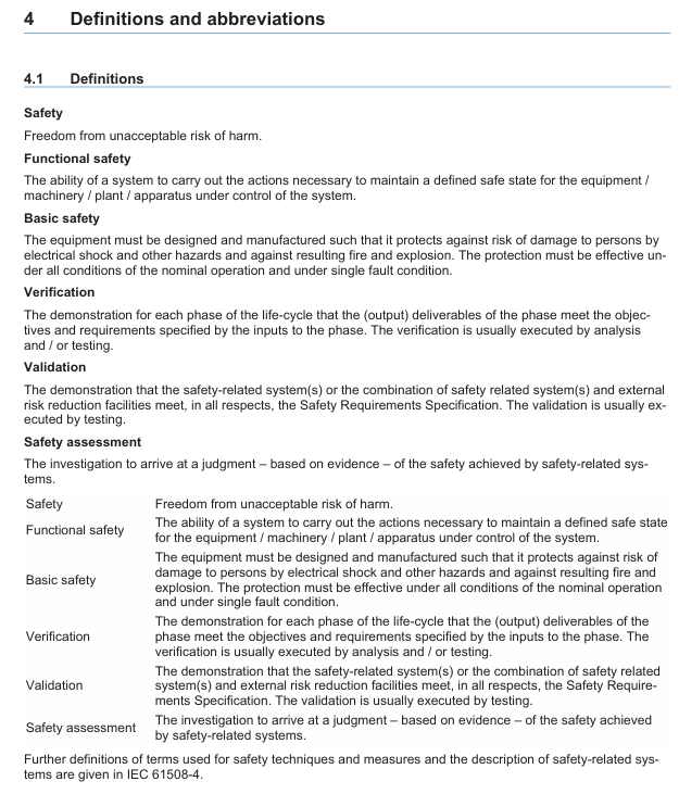 Core definition: Clearly define terms such as "Safety", "Functional safety", "Basic safety", "Verification", "Validation", "Safety assessment", etc., in accordance with the relevant interpretations of IEC 61508-4 standard.