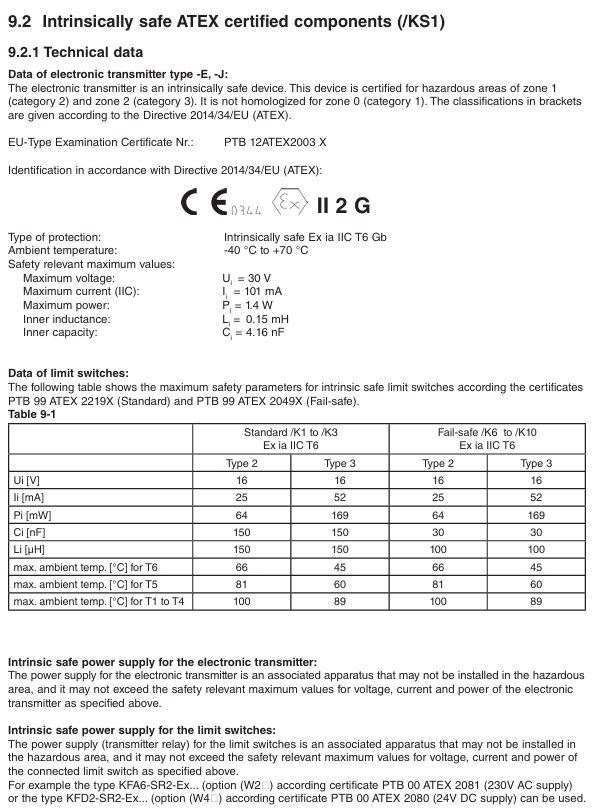 ATEX/KS1 (intrinsic safety) Ex ia IIC T6 Gb Zone 1/2 (gas), Zone 21/22 (dust) Ui=30V, Ii=101mA, Pi=1.4W