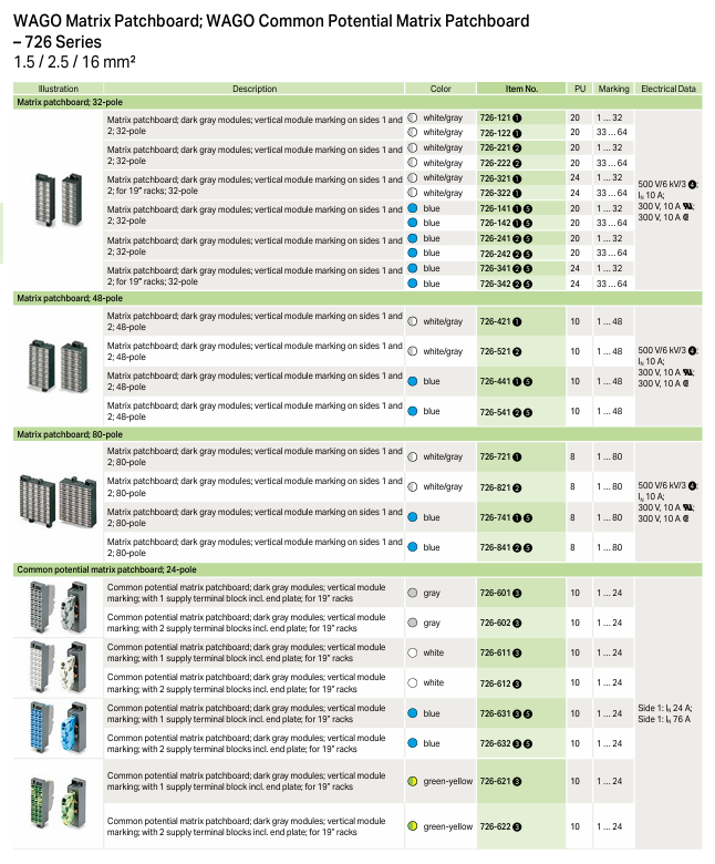 Matrix terminal block (726 series): 32-80 pole design, supporting vertical identification, with common potential distribution module, compatible with 0.08-16mm ² conductors, rated current 10-76A.