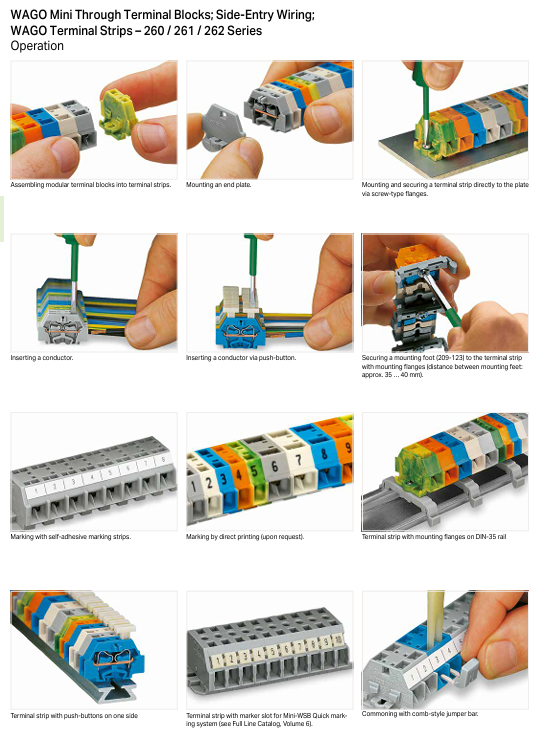 264 series (0.08-2.5mm ²): compatible with DIN-15/35 rails, with quick installation feet, rated voltage 800V, rated current 24A.