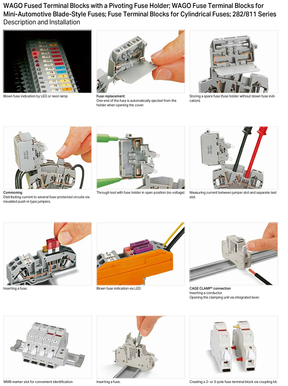 281 series 0.08-4mm ² through/ground/fuse/isolation switch terminal block with rotatable fuse holder, some with LED fuse indication rated voltage 800V, rated current 10-26A, control circuit requiring overload protection