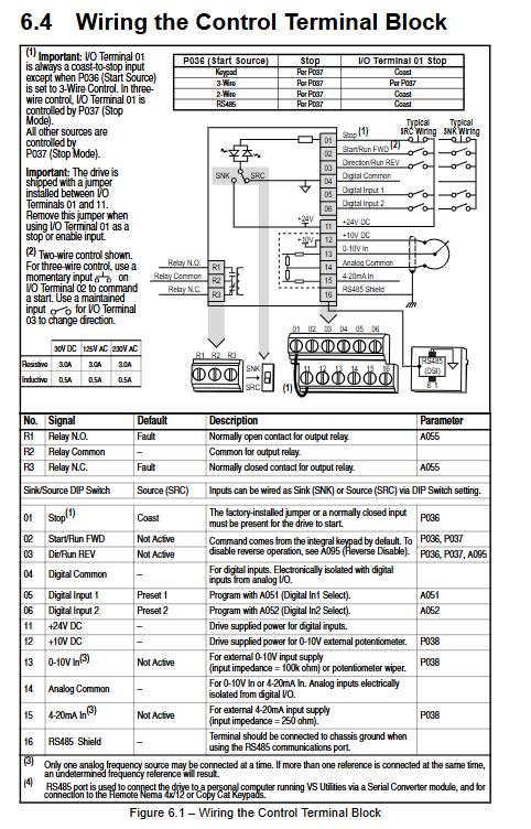 Startup source selection (P036): Supports keyboard (default), 3-wire control, 2-wire control, RS485 remote, different modes correspond to different wiring logic (such as 3-wire control requiring Start/Stop terminal configuration).