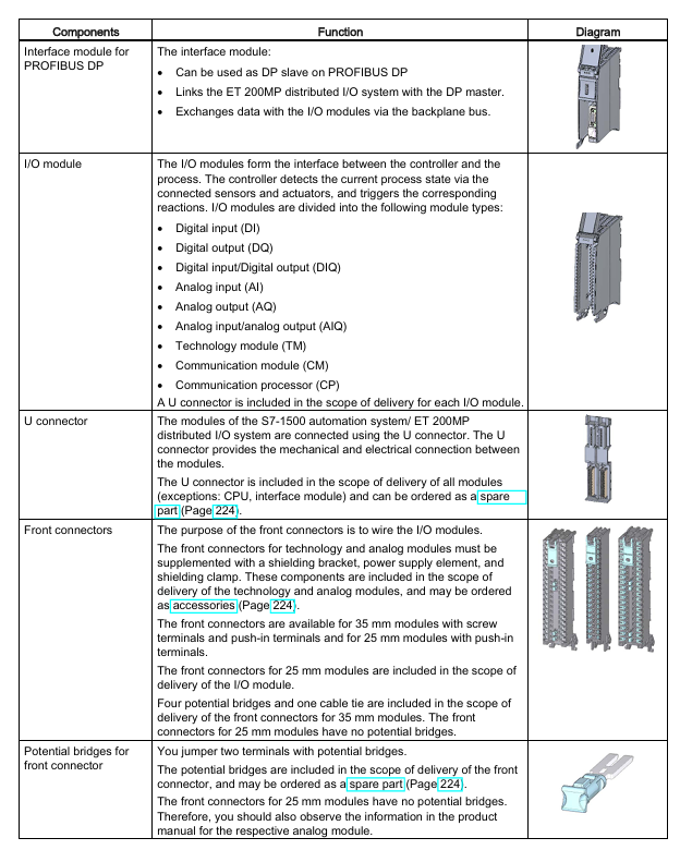Accessories list: Core accessory models (such as front connector 6ES7592-AM00-0XB0, potential bridge 6ES7592-3AA00-0AA0);