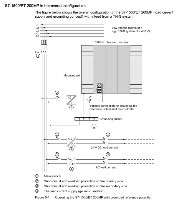 Load Power Supply (PM): Provides power to I/O module input/output circuits, sensors/actuators, without backplane bus connection, installed on rails but not occupying slots, recommended Siemens SIMATIC series (PM 70W/190W 120/230V AC).
