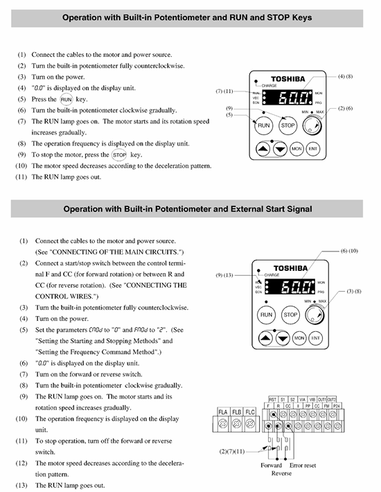 Power on: MCCB is closed, and the panel displays the "TOSHIBA" logo before entering the standby interface (displaying "0.0Hz").