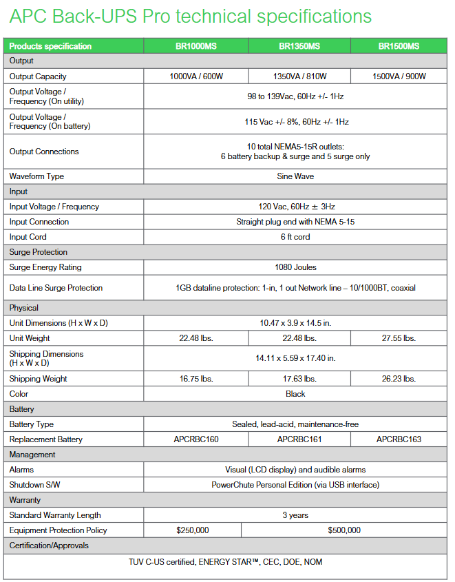 The APC Back UPS Pro series (including BR1000MS/BR1350MS/BR1500MS models) is a high-end battery backup and surge protection device designed for small/home office, gaming devices, and other scenarios. Its core features include sine wave output, 6 battery backup sockets, 2 USB charging ports (Type-C+Type-A), 1Gb network and coaxial cable surge protection, support for Active PFC compatibility and PowerChute personal version automatic shutdown software, with output capacity covering 1000-1500VA (600-900W), and a maximum battery life of up to 150 minutes (BR1500MS with entry-level desktop and display devices). It provides a 3-year standard warranty and a maximum device protection policy of $500000, which can protect critical electronic devices in power outages, surges, and other scenarios. Continuously running.