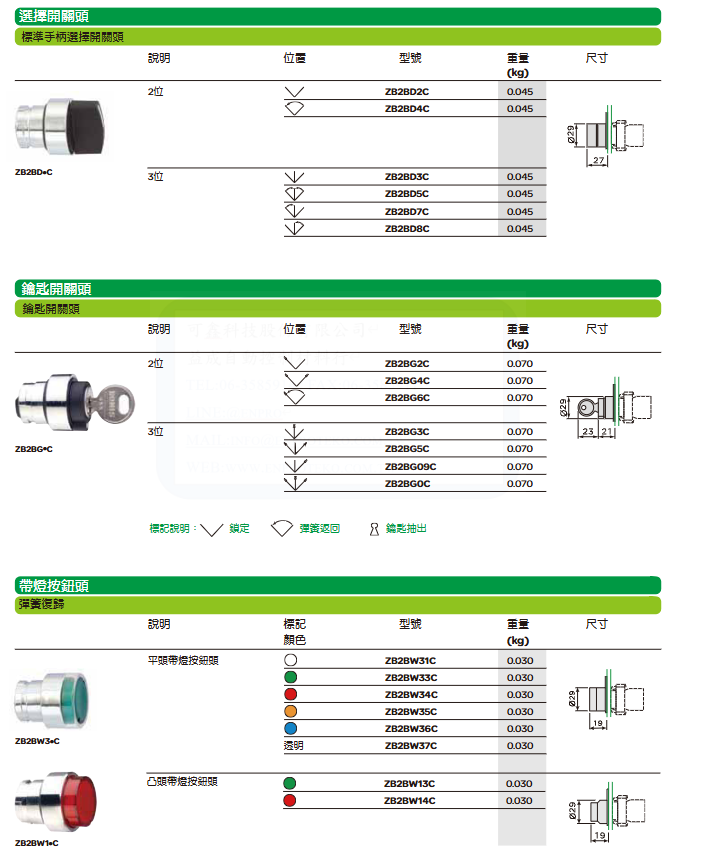 The protruding button head has no light, and multiple colors are available: ZB2BL2C, ZB2BL3C 0.030